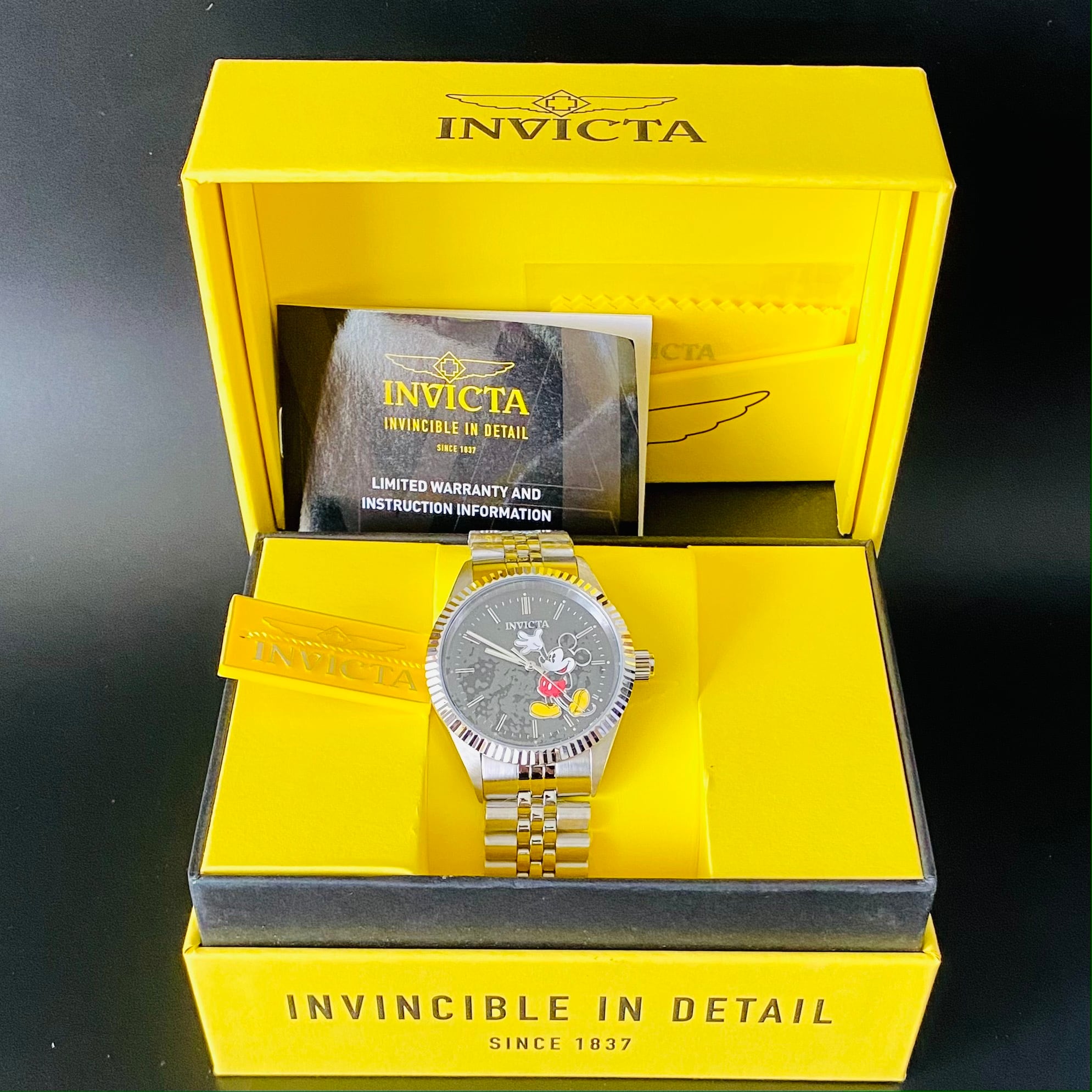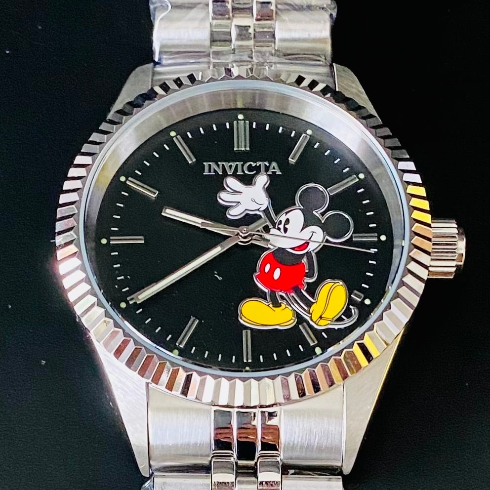 盤面には、可愛らしいミッキー、黒の盤面、高級時計などで見られるベゼルが山型に加工された、 フルーテッドベゼル、